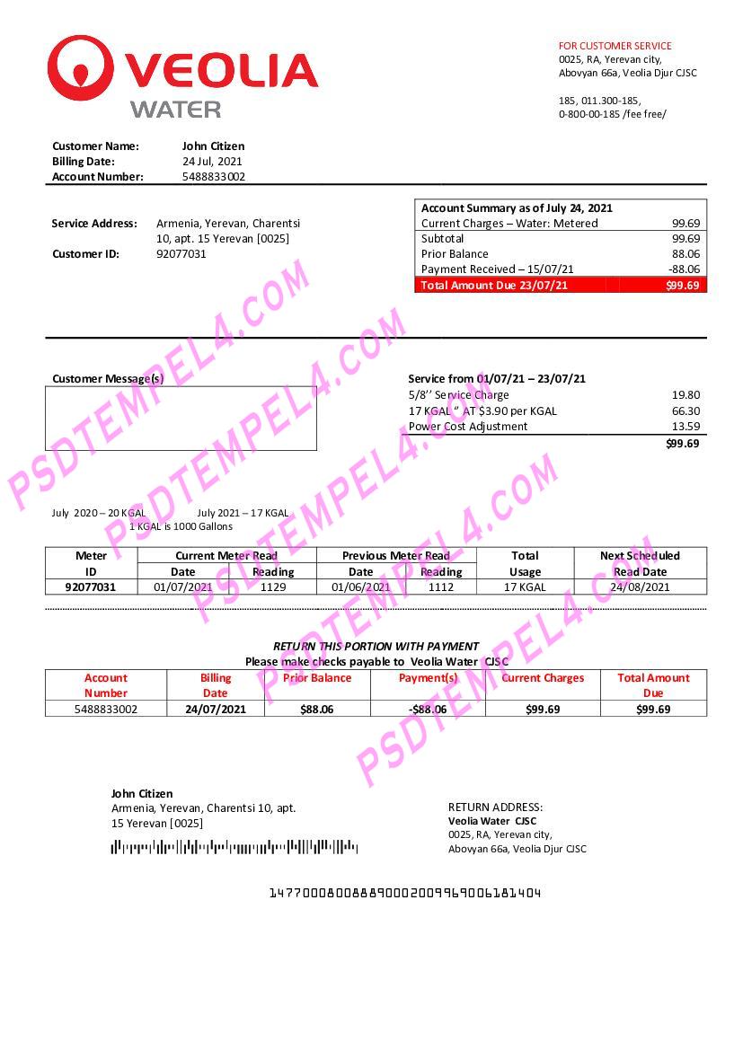 Armenia Veolia Water Utility Bill PDF File Free Download