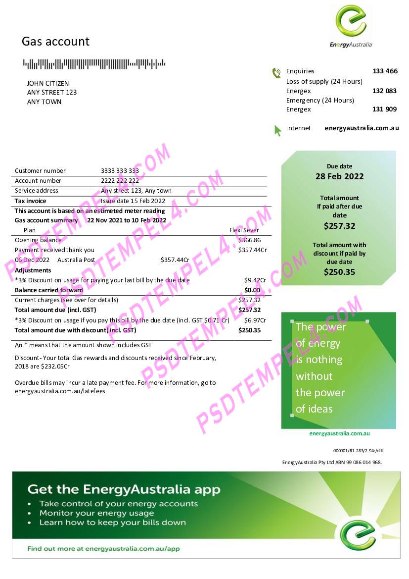 Australia Energy gas Utility Bill Proof of Address word pdf