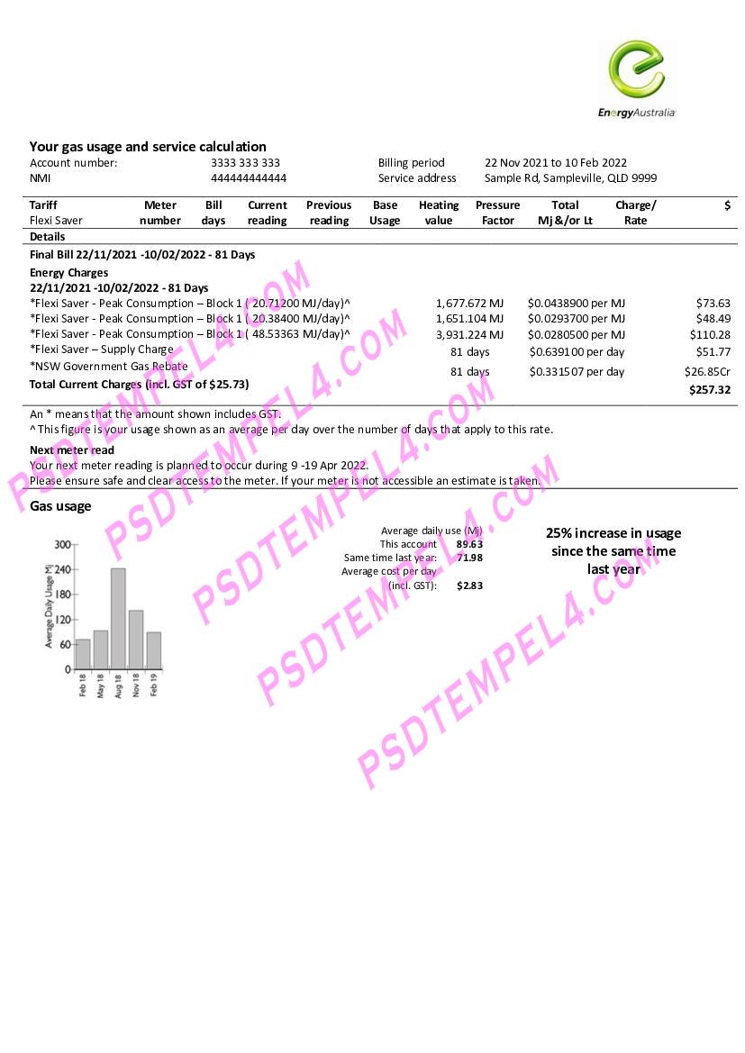 For the most up-to-date formats, you can download Australia utility bill 2025 versions. These updated templates reflect the latest design and format used by Australia Energy gas for the current year. Whether you need a new bill for proof of address or are managing administrative tasks, this updated version ensures you have the most accurate and current billing information.