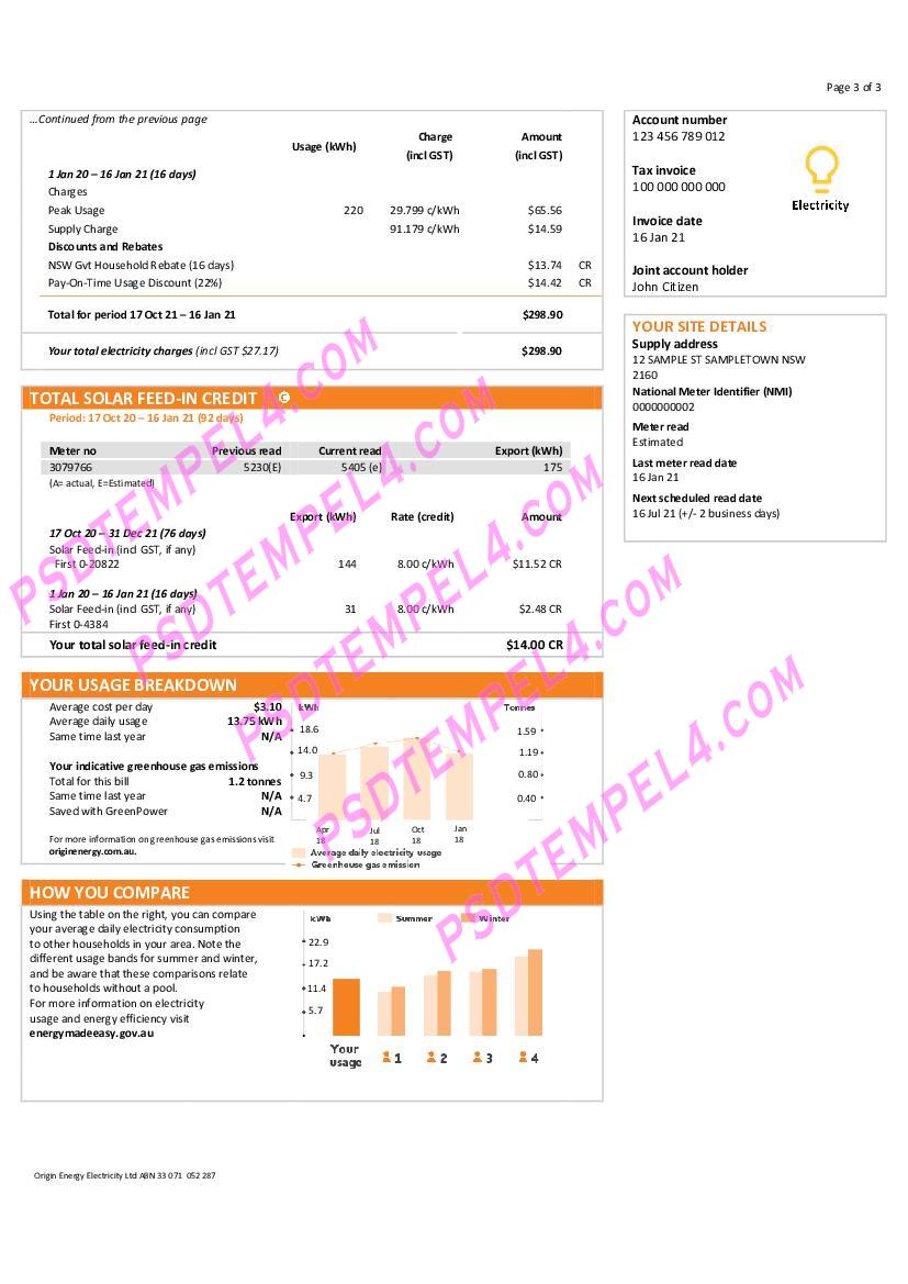 example Australia New South Wales NSW Origin electricity Utility Bill?
