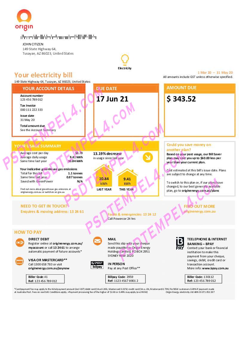 Australia New South Wales NSW Origin electricity Utility Bill Proof of Address word pdf