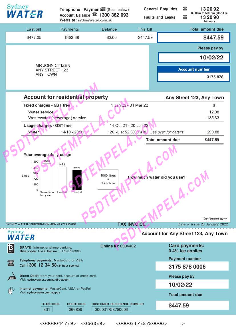 Australia Sydney Water Utility Bill Proof of Address word pdf