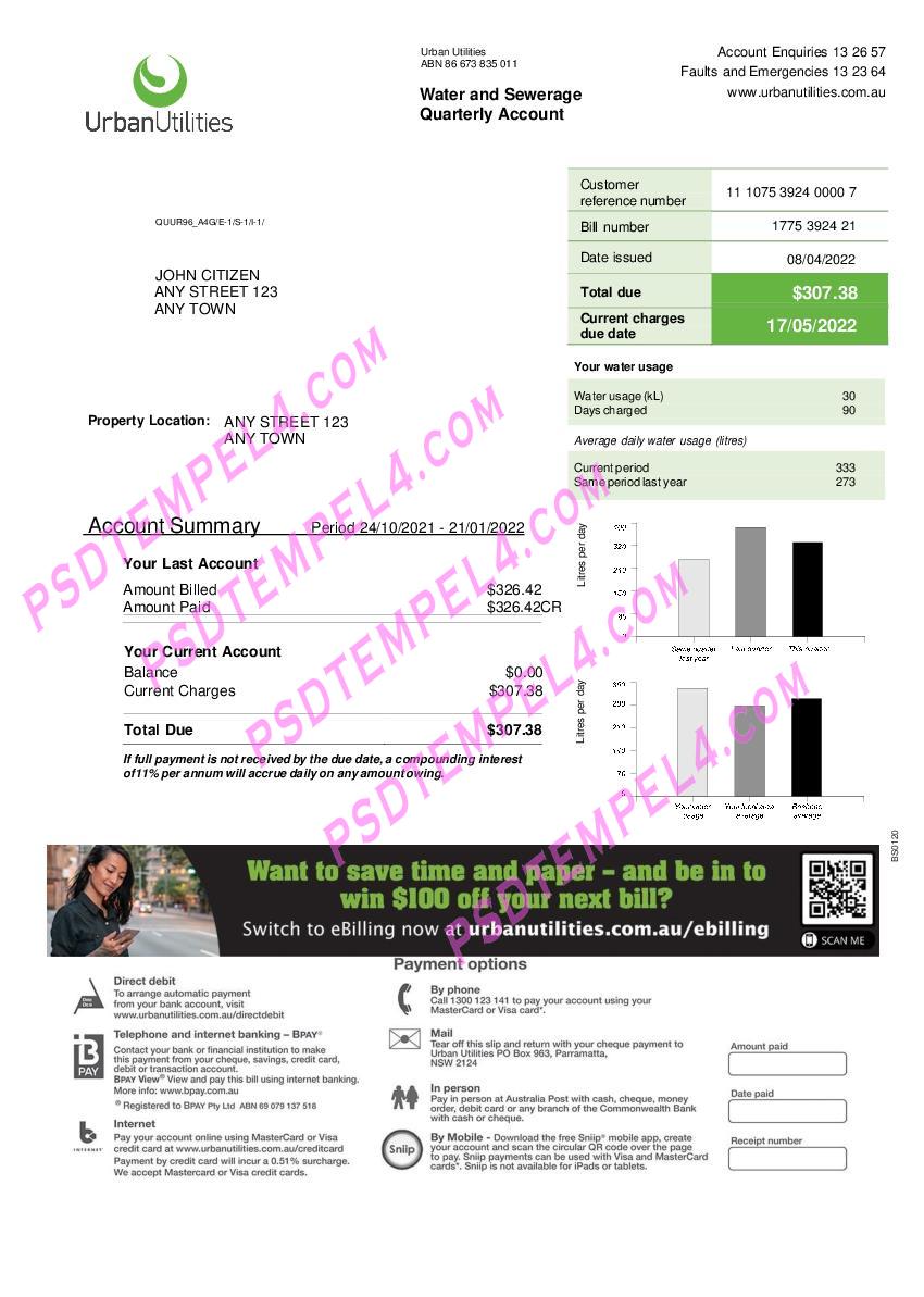 For the most up-to-date formats, you can download Australia utility bill 2025 versions. These updated templates reflect the latest design and format used by Australia Urban for the current year. Whether you need a new bill for proof of address or are managing administrative tasks, this updated version ensures you have the most accurate and current billing information.