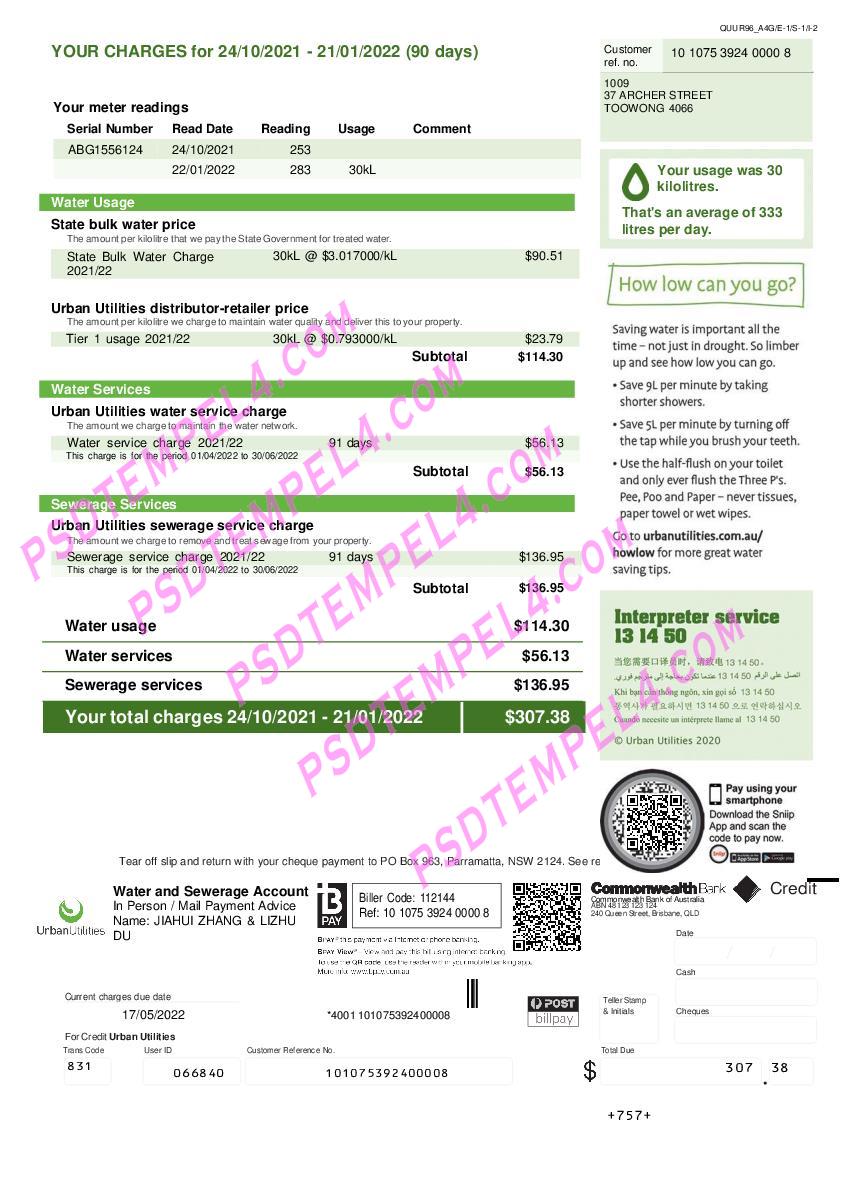 Australia Urban utility bill as proof of address. editable templates, free downloads example Australia utility bill format PDF Word