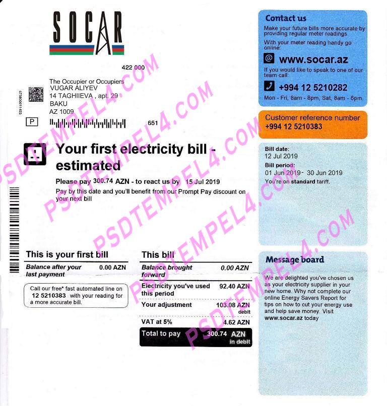 Azerbaijan Socar electricity PSD utility bill as proof of address. editable templates, free downloads example Azerbaijan utility bill format PDF Word