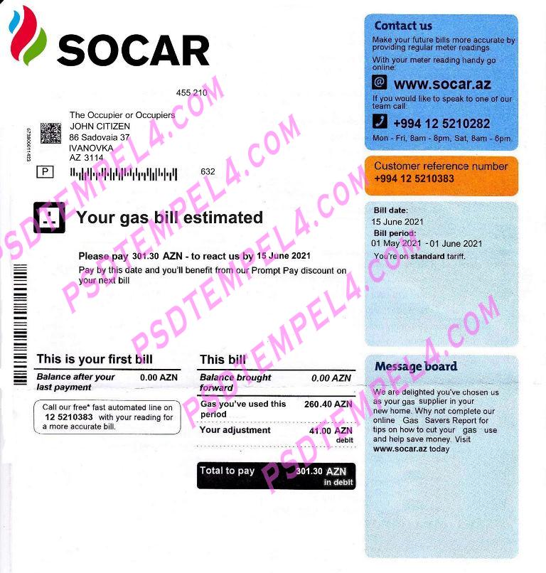 Azerbaijan Socar Gas psd utility bill as proof of address. editable templates, free downloads example Azerbaijan utility bill format PDF Word