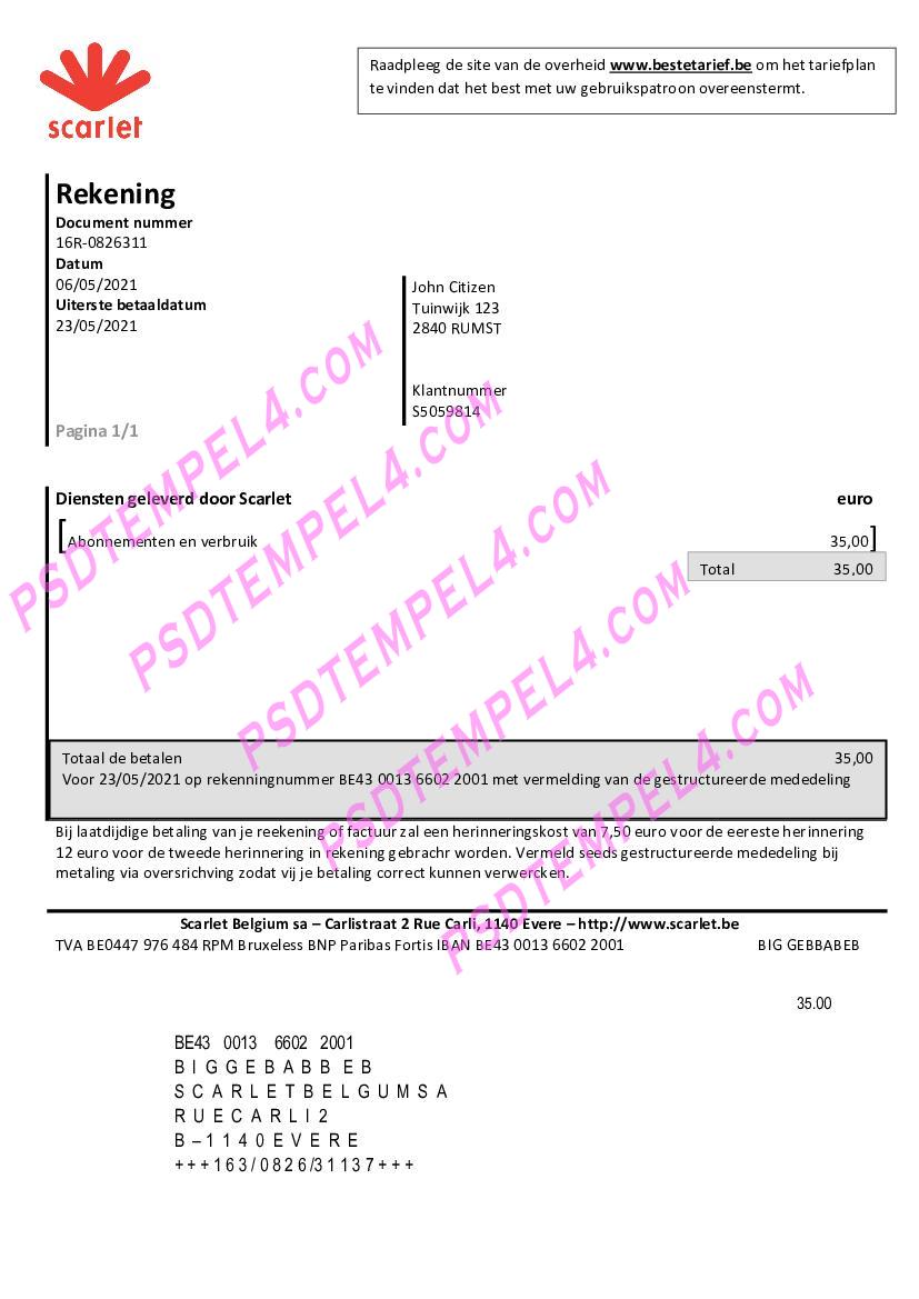 Belgium Scarlet telecommunications utility bill as proof of address. editable templates, free downloads example Belgium utility bill format PDF Word