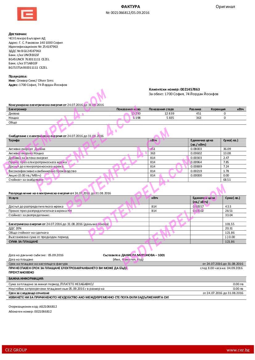 Bulgaria electricity utility bill as proof of address. editable templates, free downloads example Bulgaria utility bill format PDF Word