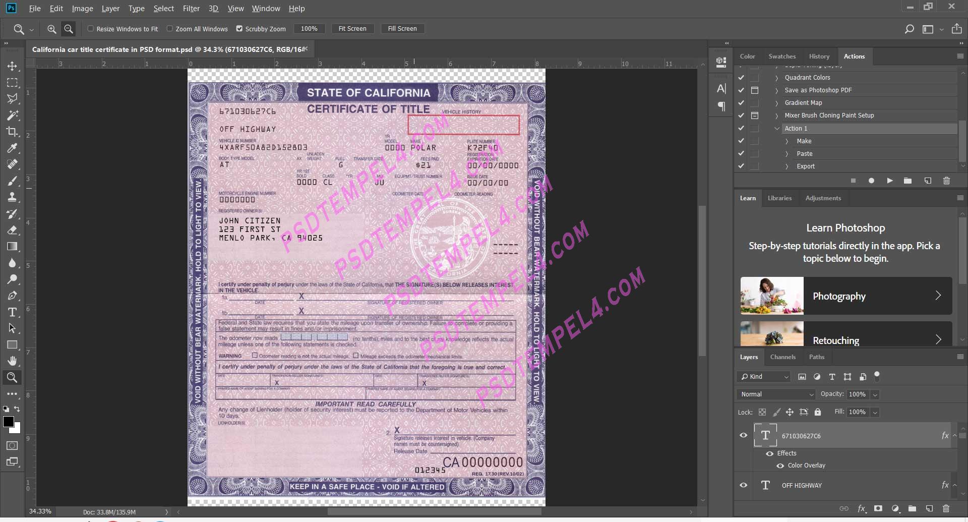 Sample California Car Title PSD in Photoshop Format