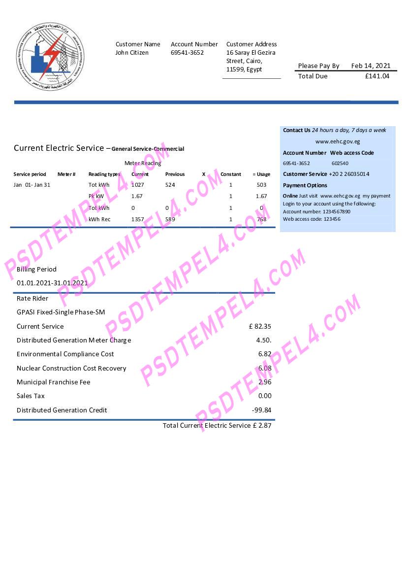 Egypt Egyptian Electricity utility bill as proof of address. editable templates, free downloads example Egypt utility bill format PDF Word