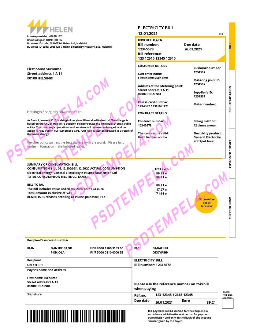For the most up-to-date formats, you can download Finland utility bill 2025 versions. These updated templates reflect the latest design and format used by Finland Helen electricity for the current year. Whether you need a new bill for proof of address or are managing administrative tasks, this updated version ensures you have the most accurate and current billing information.