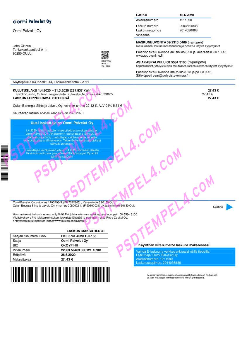 Finland Oomi Palvelut Oy electricity utility bill as proof of address. editable templates, free downloads example Finland utility bill format PDF Word