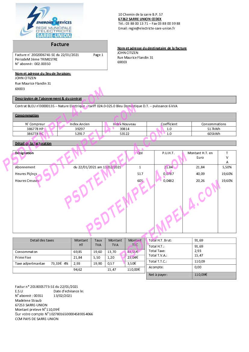 For the most up-to-date formats, you can download France utility bill 2025 versions. These updated templates reflect the latest design and format used by France Energies & Services Régie Municipal d’ Electricité Sarre-Union electricity for the current year. Whether you need a new bill for proof of address or are managing administrative tasks, this updated version ensures you have the most accurate and current billing information.