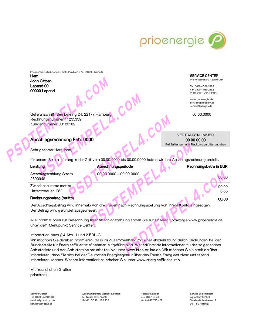 Germany Prioenergie utility bill as proof of address. editable templates, free downloads example Germany utility bill format PDF Word