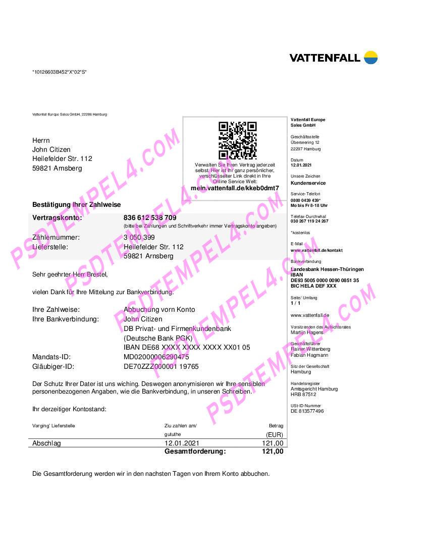 Germany Vattenfall Utility Bill PDF File Free Download