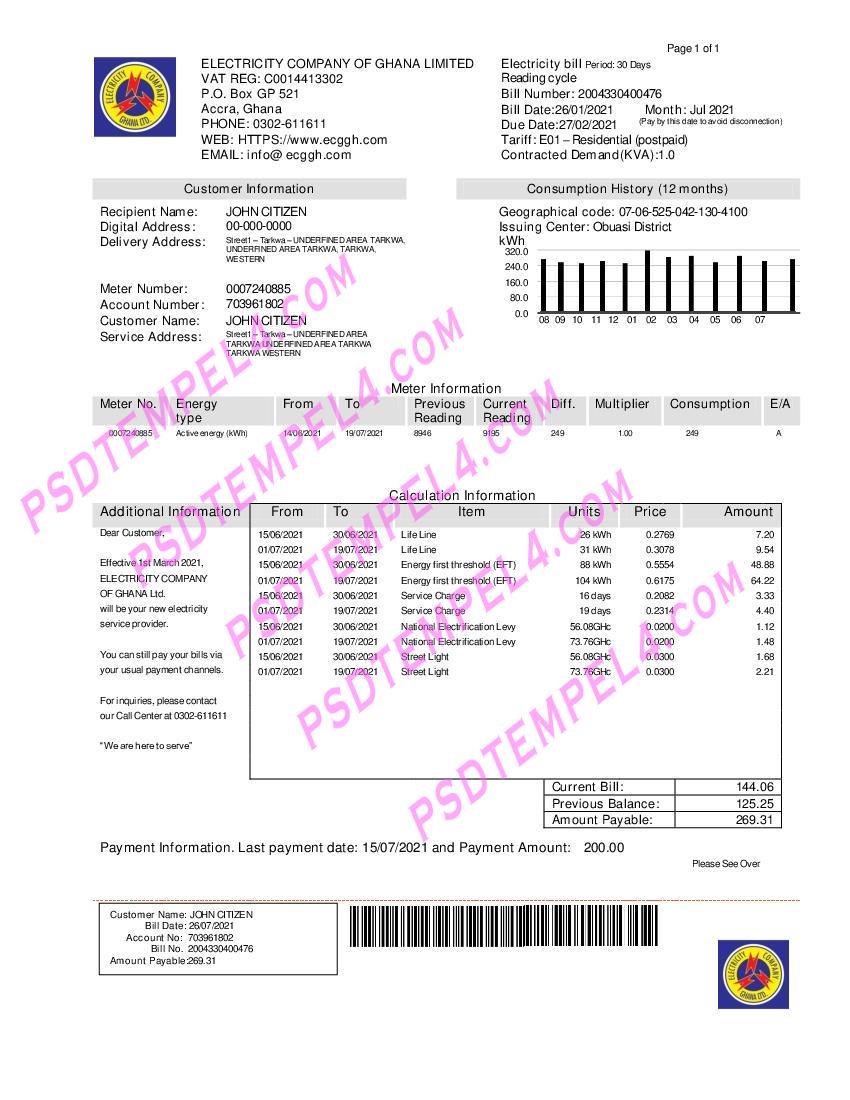 For the most up-to-date formats, you can download Ghana utility bill 2025 versions. These updated templates reflect the latest design and format used by Ghana Electricity Company of Ghana for the current year. Whether you need a new bill for proof of address or are managing administrative tasks, this updated version ensures you have the most accurate and current billing information.