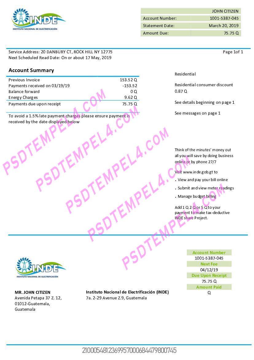 For the most up-to-date formats, you can download Guatemala utility bill 2025 versions. These updated templates reflect the latest design and format used by Guatemala INDE Instituto Nacional de Electrificacion electricity for the current year. Whether you need a new bill for proof of address or are managing administrative tasks, this updated version ensures you have the most accurate and current billing information.