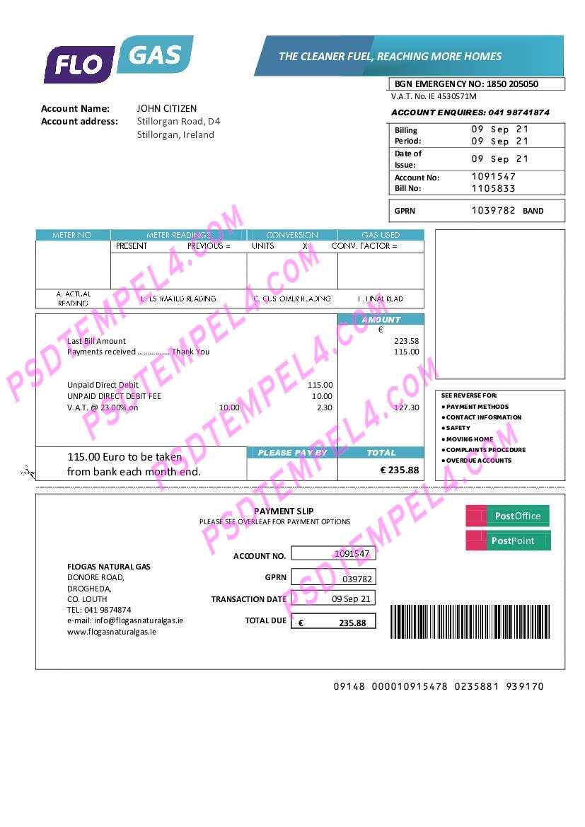 Ireland Flogas Natural Gas utility bill as proof of address. editable templates, free downloads example Ireland utility bill format PDF Word