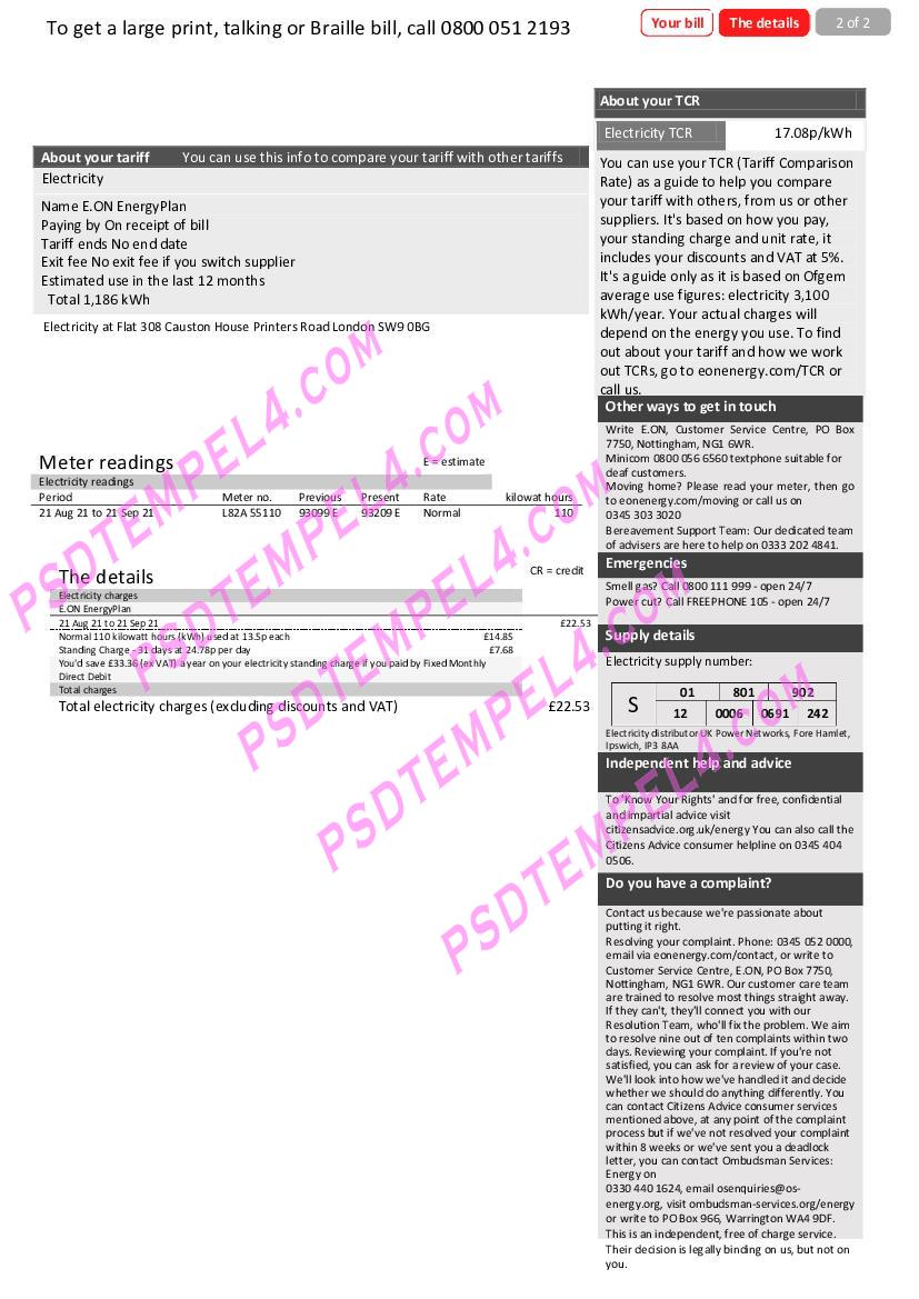 UK United Kingdom E.ON electricity V1 Utility Bill Proof of Address word pdf