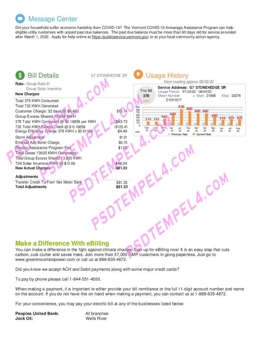 USA Colchester Vermont Green Mountain Power utility bill as proof of address. editable templates, free downloads example USA utility bill format PDF Word