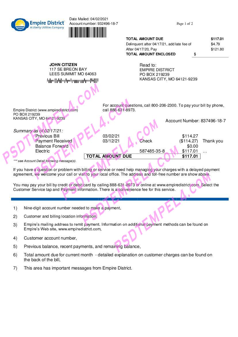 USA Empire District Electric Company utility bill as proof of address. editable templates, free downloads example USA utility bill format PDF Word