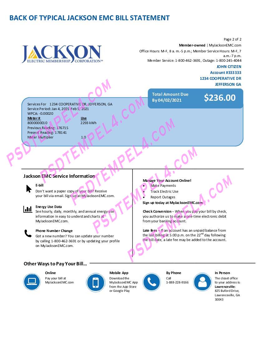 USA Georgia JACKSON EMC utility bill as proof of address. editable templates, free downloads example USA utility bill format PDF Word